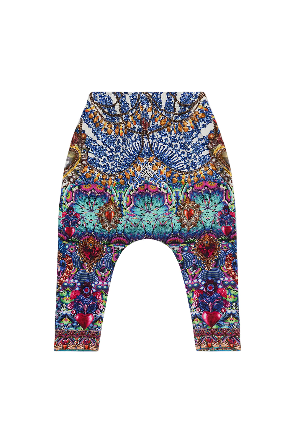 Inviting moments of neon to your little one’s wardrobe, the Lucky Charms Kids Drop Crotch Harem Pant 4-10 is enwrapped by a vivid mosaic spotted with fuchsia moments, seas of aquamarine, golden amulets and the face of Frida. Crafted for the everyday, these luxury kids pants feature a relaxed silhouette, an elasticated high waist, hand-placed CAMILLA crystals and a drop crotch detail.