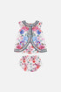 Designed in Australia, The Monserrate Magic Babies Top And Bloomer Set features a white base adorned with butterflies, leopards, and intricate details reflecting the palace's exotic gardens and eclectic architecture. Lovingly handcrafted, this adorable babies co ord set features an elasticated puff sleeved top with a chic round neckline, paired with exquisite bloomer shorts with a cute elasticated opening and mini frill edge.