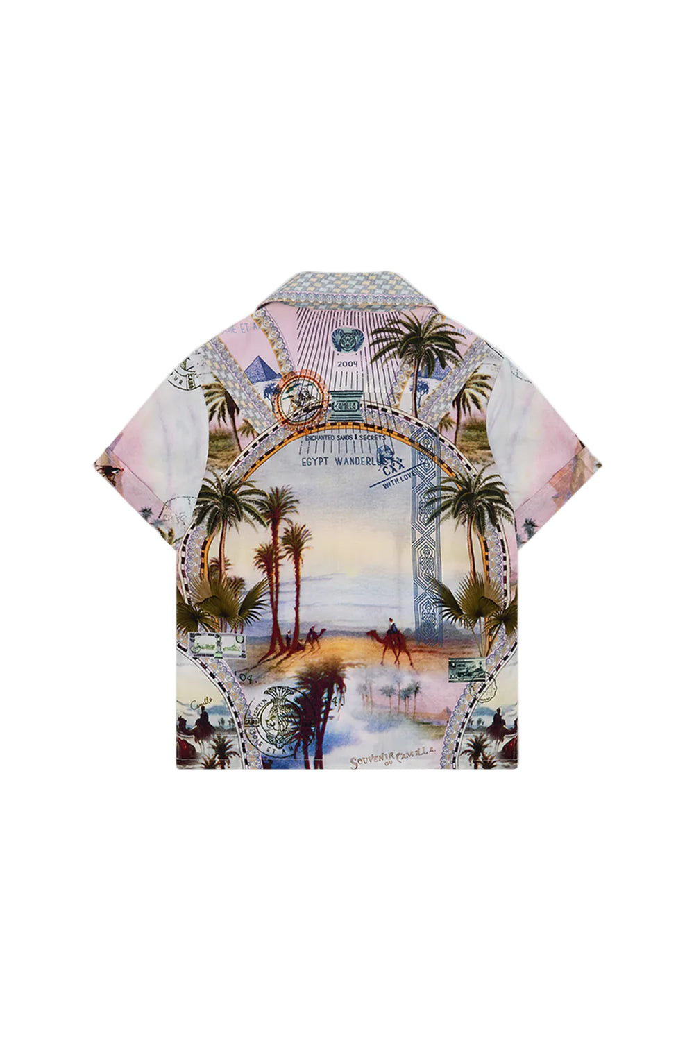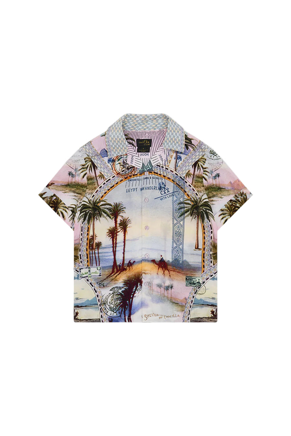 The Call Me In Cairo Boys' Short Sleeve Shirt unfurls an endless oasis luscious palms and majestic pyramids in the distance. This luxury boys shirt showcases a relaxed fit throughout the body with a soft tailored collar and button front enclosure for effortless wear. Explore more from the House Of The Sun collection.