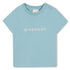This short-sleeved T-shirt from Givenchy offers a perfect blend of softness and elegance for little ones. Crafted from pure cotton, it features the brand’s iconic logo printed across the chest in contrasting white. The design includes practical snap buttons on the shoulder for easy dressing and a comfortable fit. Presented in a soft pastel blue tone, this T-shirt adds a touch of refined simplicity to baby wardrobes, ideal for everyday wear with trousers or shorts.