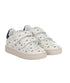 Classic ivory trainers for boys and girls, by Emporio Armani. Made in soft leather with a printed navy blue eagle logo all over. Double velcro Fastenings.