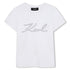 This Karl Lagerfeld Kids short sleeve t-shirt is designed in milk white with a minimalist yet stylish look. The front features the Karl signature outlined in fine stud detailing, giving a subtle sparkle to the classic silhouette. Crafted from a soft cotton and modal blend with added stretch, it ensures comfort, breathability, and flexibility for everyday wear. A versatile wardrobe staple that brings a refined touch to casual outfits.