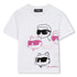 This Karl Lagerfeld Kids short sleeve t-shirt features a playful multi-character print of Karl and Choupette in bold sunglasses, adding a fun twist to a classic silhouette. Crafted in crisp white cotton, it offers softness, breathability, and comfort for everyday wear. The vibrant pink and black accents bring a contemporary touch, making it a standout piece in any child’s casual wardrobe. Perfect for pairing with jeans, shorts, or layered looks.