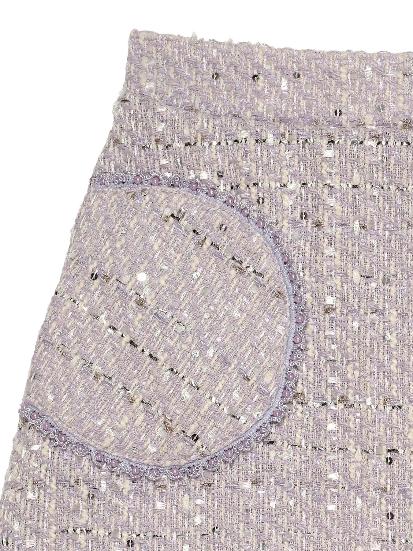 The Penelope Skirt in Lilac Boucle is a chic and versatile piece that adds sophistication to any outfit. Made from Bouclé fabric with shimmering lurex yarns, this skirt features elegant pearl details on the hem and pockets. The stretchy waistband offers comfort and flexibility, making it perfect for play or special occasions.