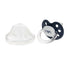Baby dummy and clip set with the eagle logo branding by Emporio Armani. The dummy has an anatomical silicone teat with a hard plastic holder and a clip with a striped fabric strap to fasten onto clothing.